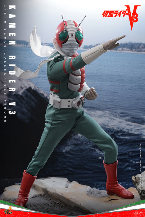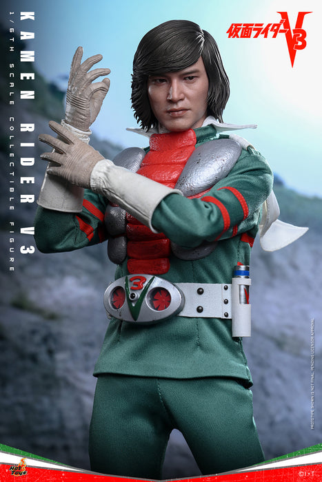 Sideshow and Hot Toys are thrilled to present the Kamen Rider V3 Sixth Scale Collectible Figure. This action figure features a V3 helmet with LED-lit green eyes and a head sculpt of Hiroshi Miyauchi as Shiro Kazami with separate rolling eyeballs, bringing expressive realism to V3’s determined gaze. Kamen Rider V3 dons his signature vibrant green suit with weathered “Redbone” and “Converter Lung”, accompanied by wire-embedded collars and short capes that adds dynamic flair. The magnetic-activated Double Typhoon Henshin belt is LED-lit and comes equipped with a V3 Hopper holster, recreating his iconic transformation sequence. The figure includes ten interchangeable hands, including fists, open hands, V-sign poses, pointing finger, knifehand strike gesture, and a hand to hold the V3 Hopper. Accessories include the V3 Hopper transmission satellite (both holstered and in deployed form), a helmet accessory for Shiro Kazami to hold, a Kamen Rider Kid Corps hat and medallion, and a figure stand with the V3 logo and nameplate. A Special Edition only available in selected markets will include a specially designed Kamen Rider V3 metal collectible card with display case.