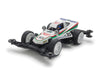 This assembly kit creates The Grasshopper Jr., an exciting Mini 4WD car that is based upon the legendary 1984 R/C car and 40-year Tamiya mainstay of the same name. The elegantly streamlined Grasshopper form looks great shrunk down to Mini 4WD car size, and its single seater buggy-inspired slimline form with foglamps is accented with a driver figure. Logos and numbers are included as stickers in the box, and the model runs on the compact VZ chassis.